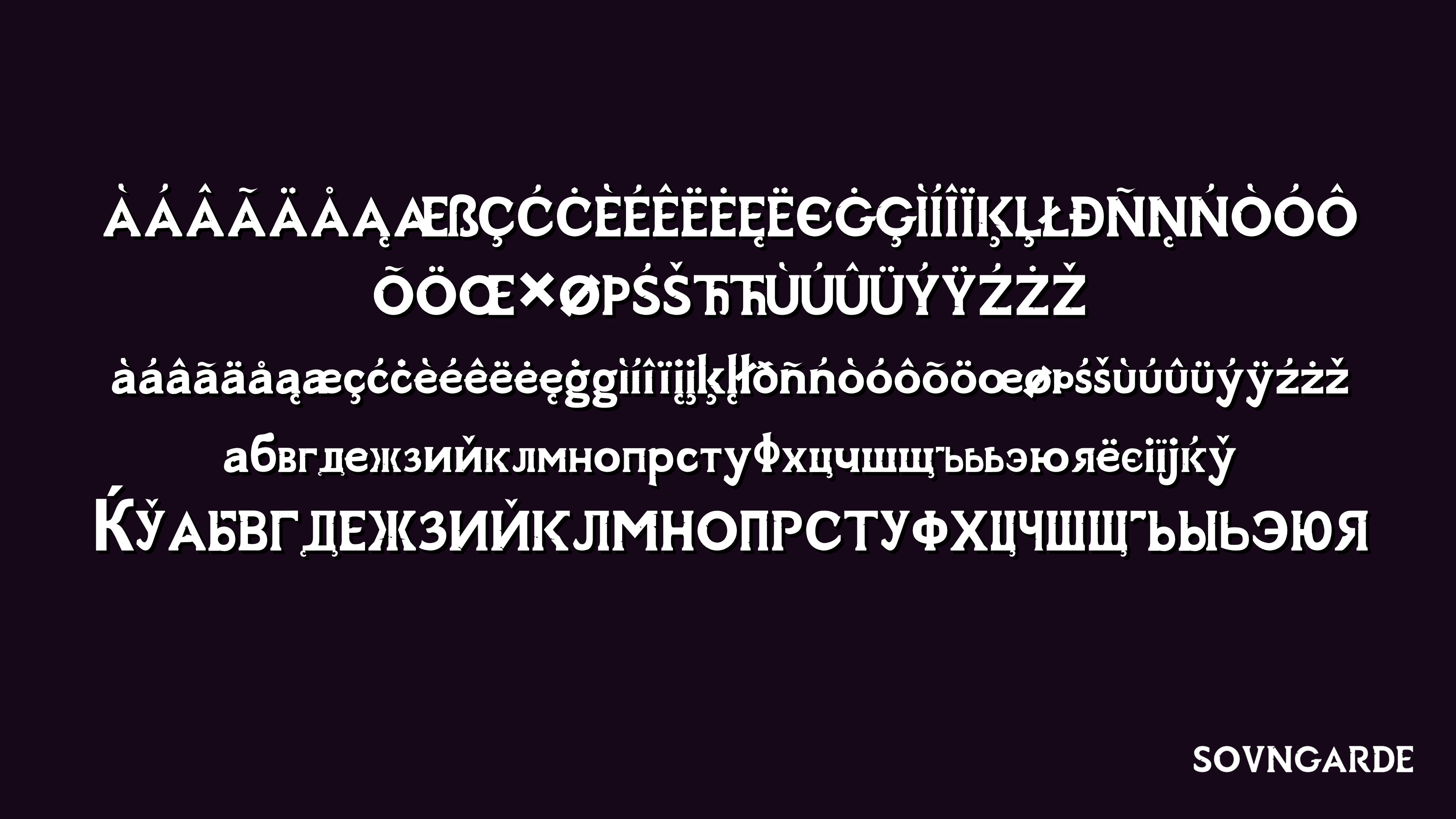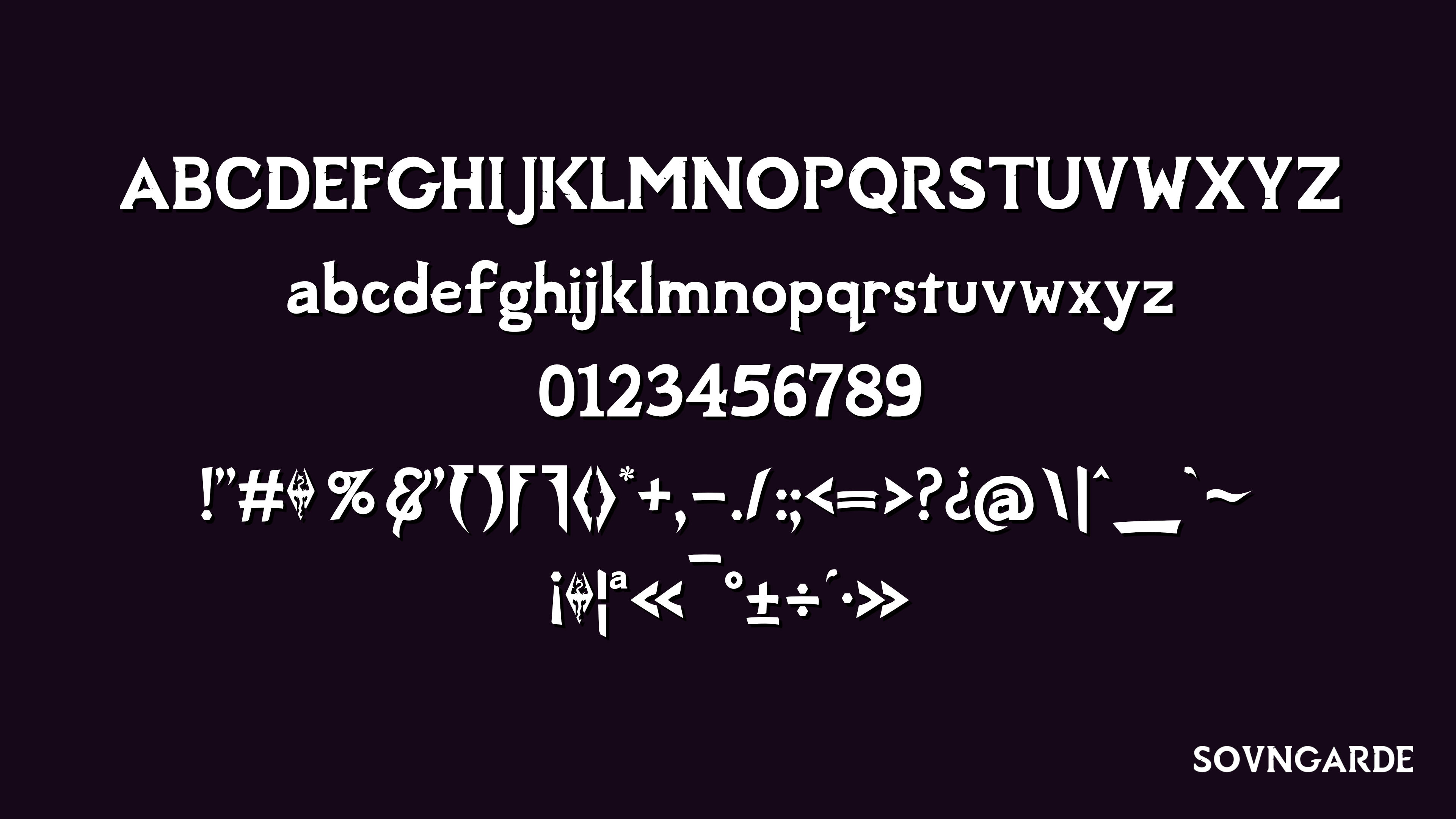 This project began in 2016 with the release of Sovngarde as a font replacement mod for Skyrim, inspired by the title font of the game and designed by hand using FontForge. It since grew to serve millions of players across 8 supported languages (English, French, German, Italian, Spanish, Portuguese, Polish & Russian).